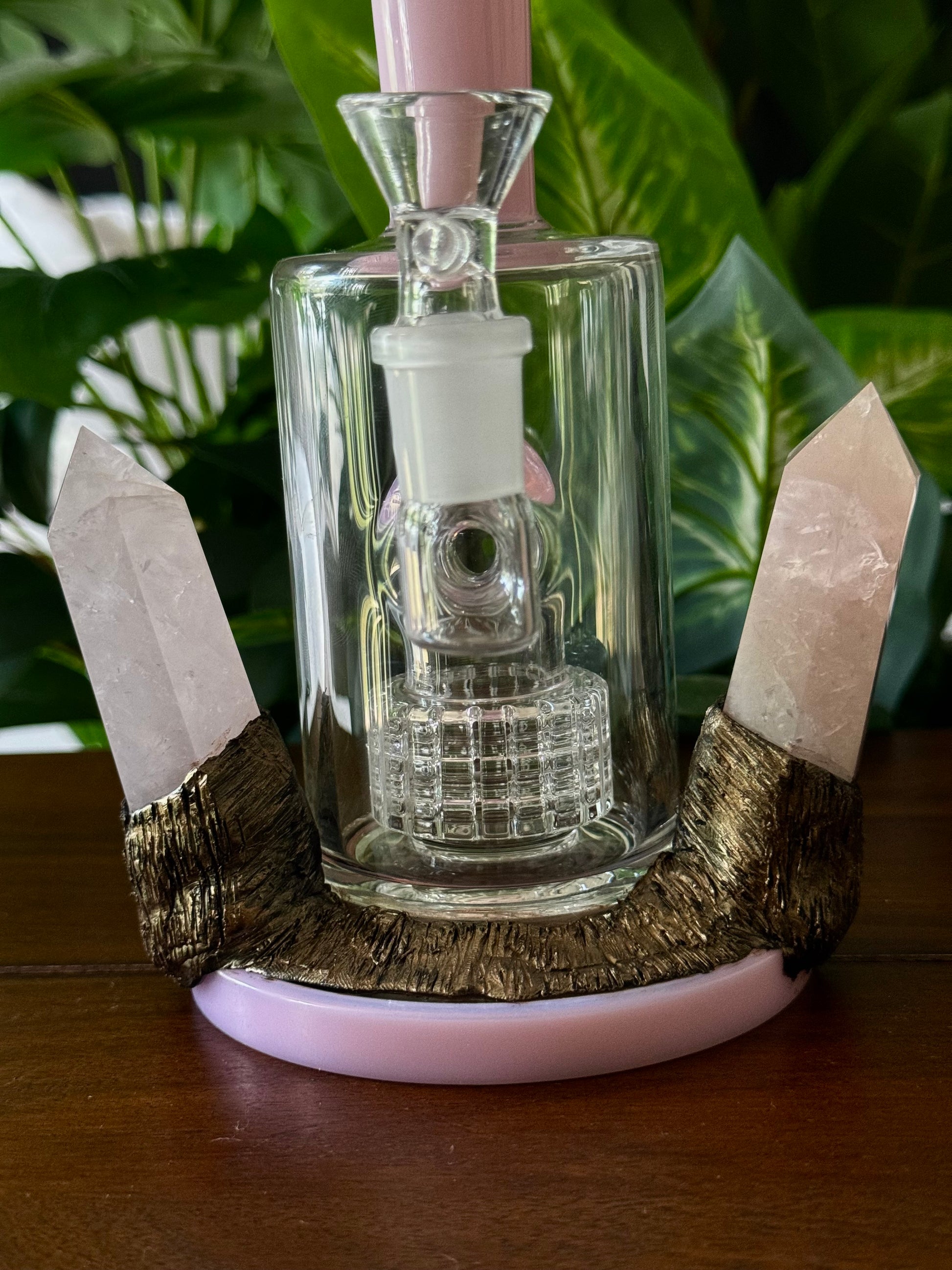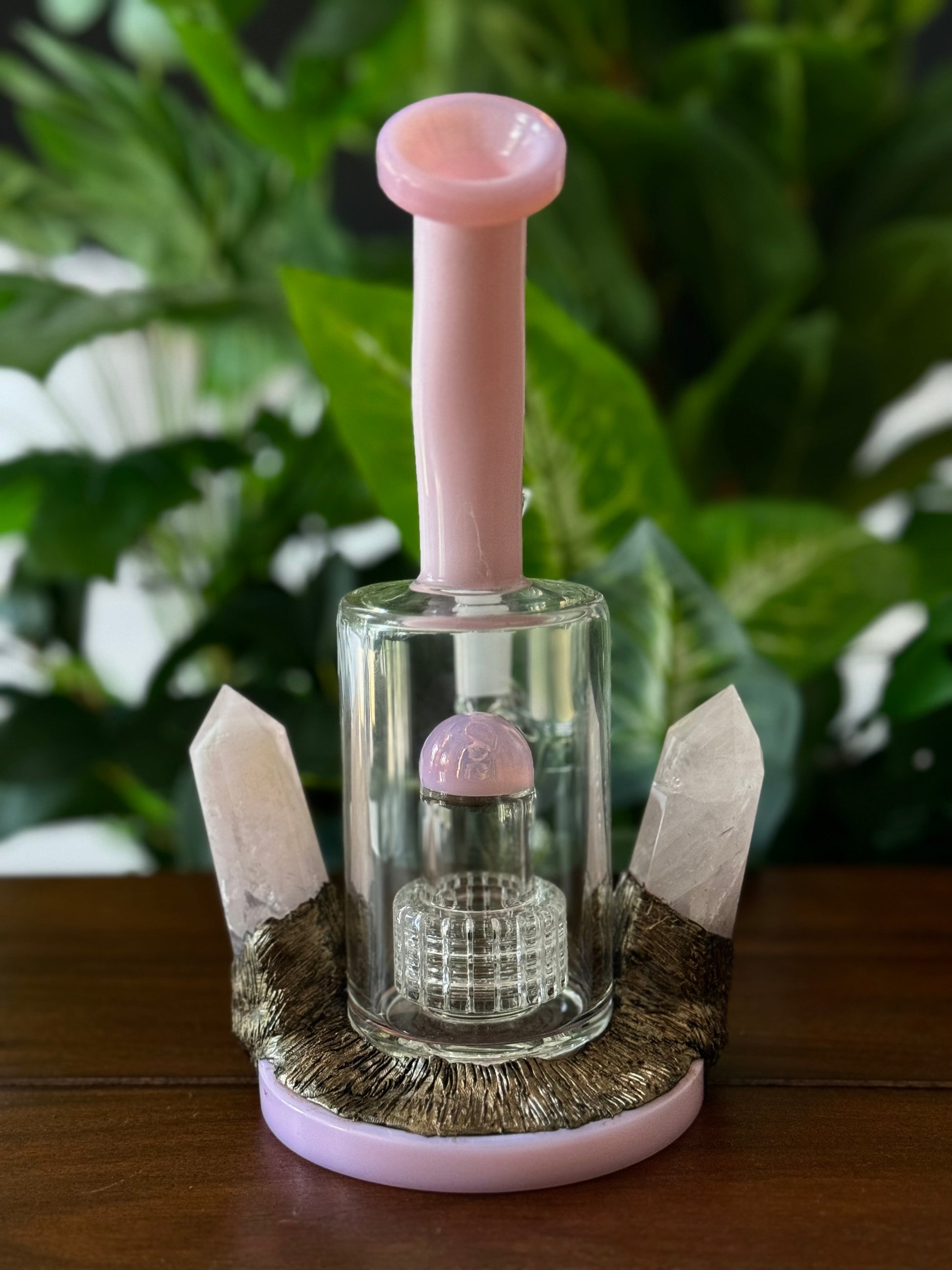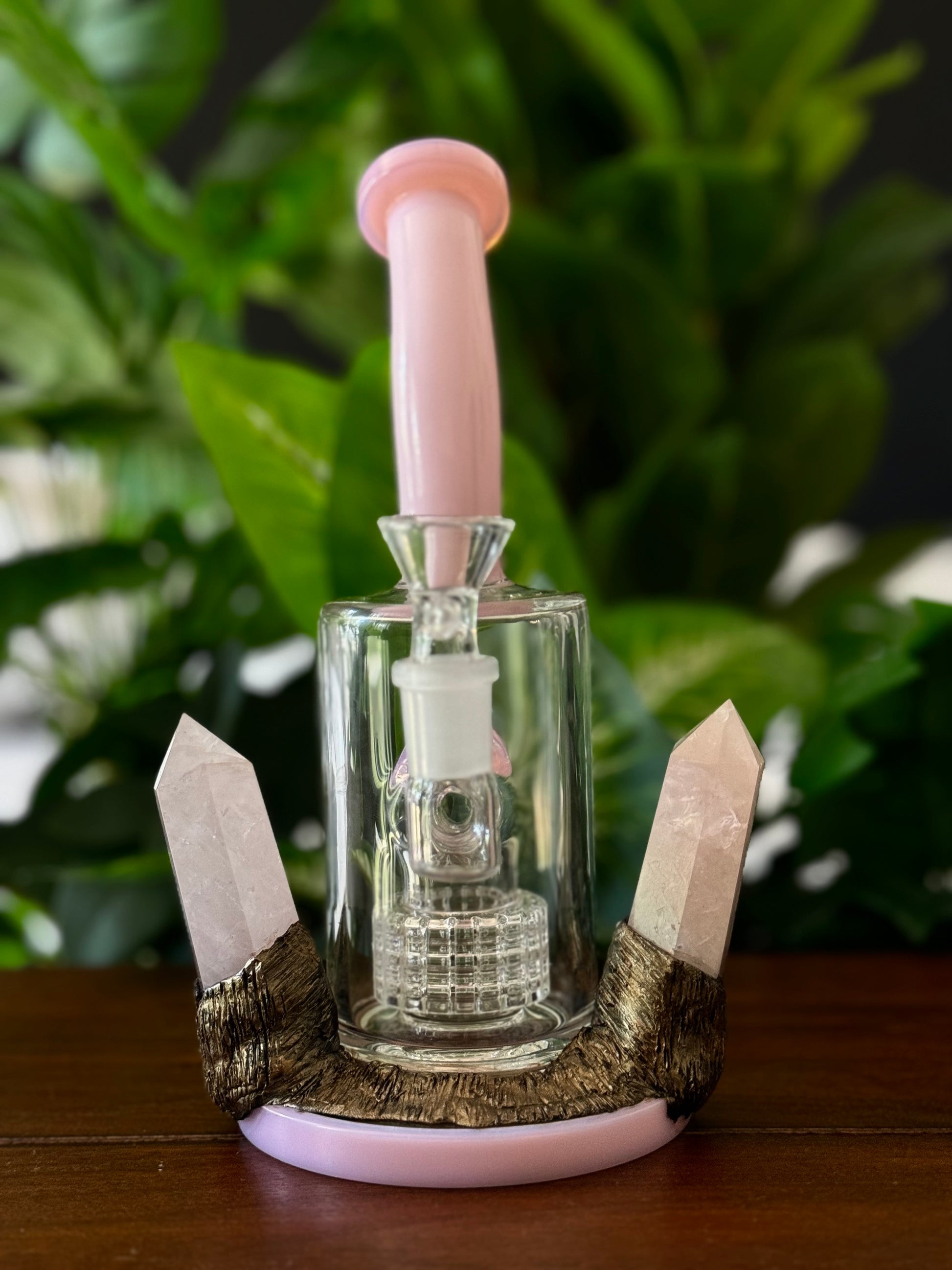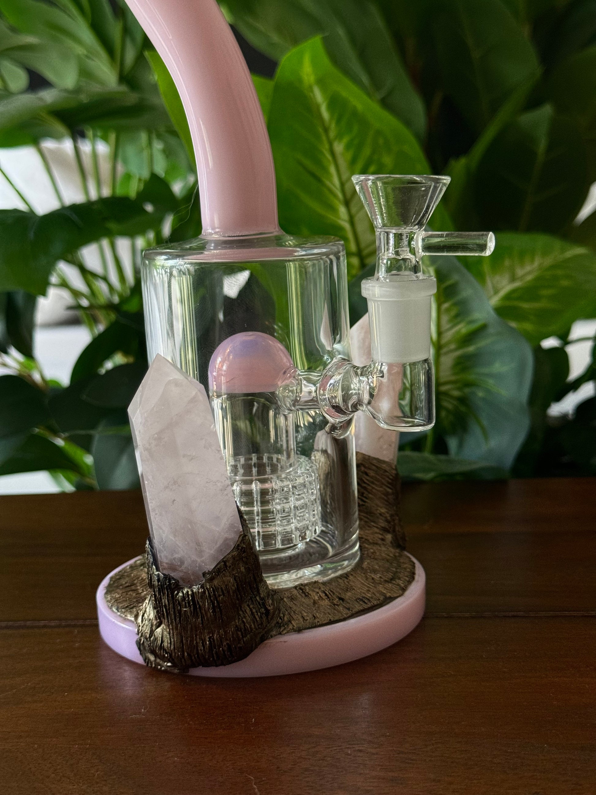 One of a kind rose quartz water pipe infused with natural elements.